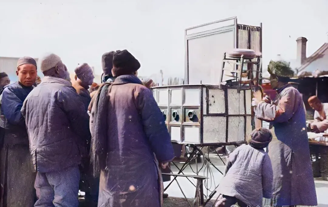 这东西叫“拉洋片”,玻璃镜子一阵吸引人,孩子扒着机子往里瞧,旁边老头儿咳两声也得停下来围观,多新鲜一玩意儿,那时没别的乐子,能凑着瞧一回就挺知足,这东西现在小孩再看,恐怕要问“动画片在哪儿”。