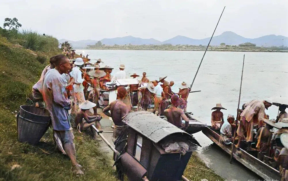 图中老遂宁的渡口,码头上人头攒动,光景在船板和河水之间打转,挑夫、轿夫,背上全是汗渍花衣,旁边竹篓油篓一溜排开,河面宽宽的,却全靠这窄渡口续着烟火气,水面泛光,灌木成片,谁家赶集,谁去对岸打熬生活,都是这么走,爷爷常说,那时哪怕赶上水大,也是硬着头皮划过去。