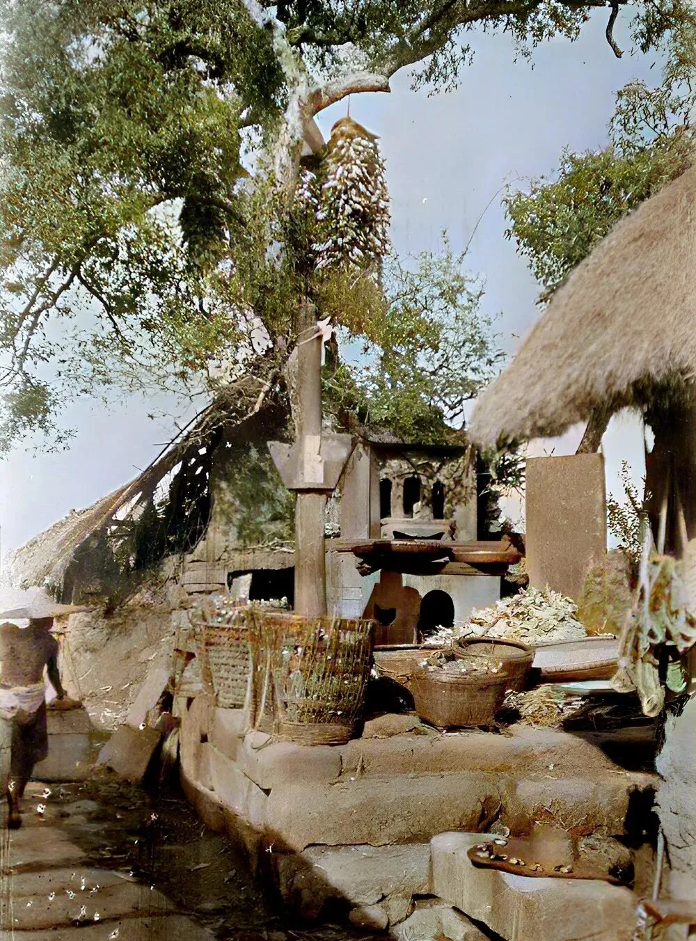 这个村子的门头抢眼,石板路一拐进来,左边有座老石塔,叫字库塔,旁边树上吊着一大堆圆锥形的草垛子,乡下人喊它草树,就是秋天收成晒干的稻草搭成的窝棚,庄稼忙完,孩子们最喜欢钻进去玩,左边边角还有土墙房,屋顶糊满茅草,顺风一个飘絮,总有人家门前晒着谷物。