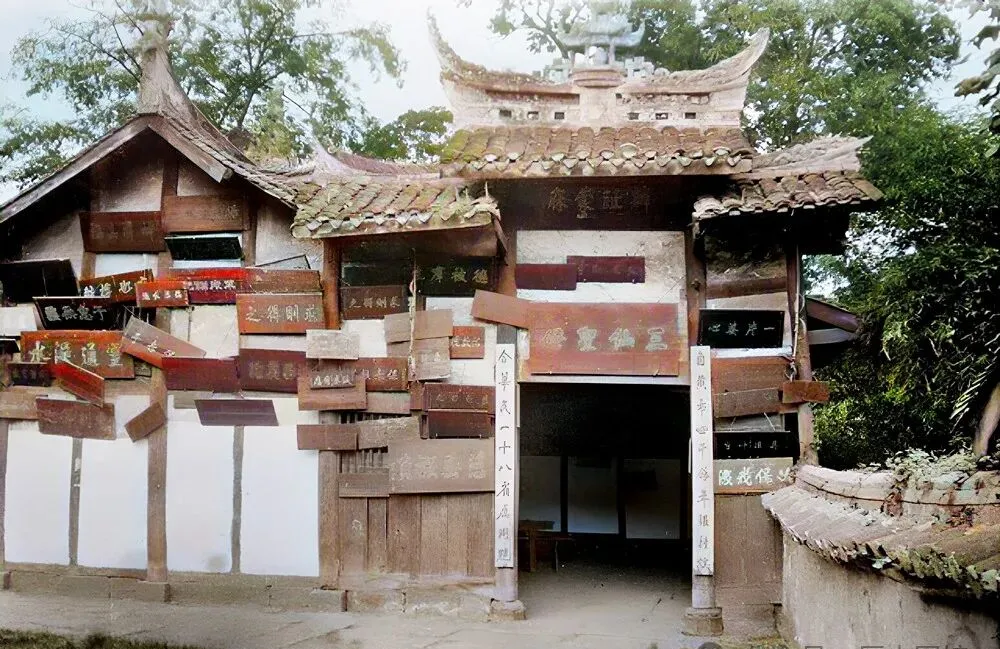 这是庙门口,木门额上大大的**“三仙圣母”**,但最特别的是门口墙上钉满各种匾额,黑青色的木板上红字金字交错,仿佛在诉说谁来过,谁捐了香火,树影斑驳盖下来,院里头还有翠竹掩映,大树成荫,这些老匾早不常见,那会儿谁家有事,求平安必定先来磕个头。