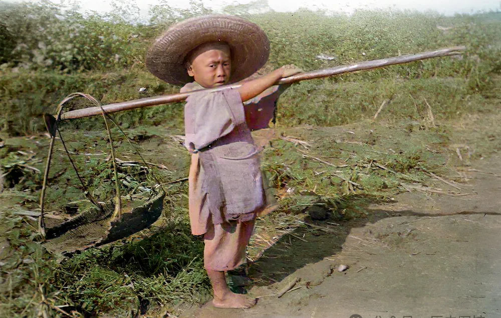 这小男孩戴着一顶大草帽,肩膀扛着竹箩和锄头,神情认真,目光紧了点,衣裳是褪了色的粗布,脚下没穿鞋,一副小大人的样子,村里常有人说,这样的孩子苦是苦,可心里有股不服输的力气,我小时候也跟着大人扛锄下地,后背晒得发烫,心里就觉自己长大了。