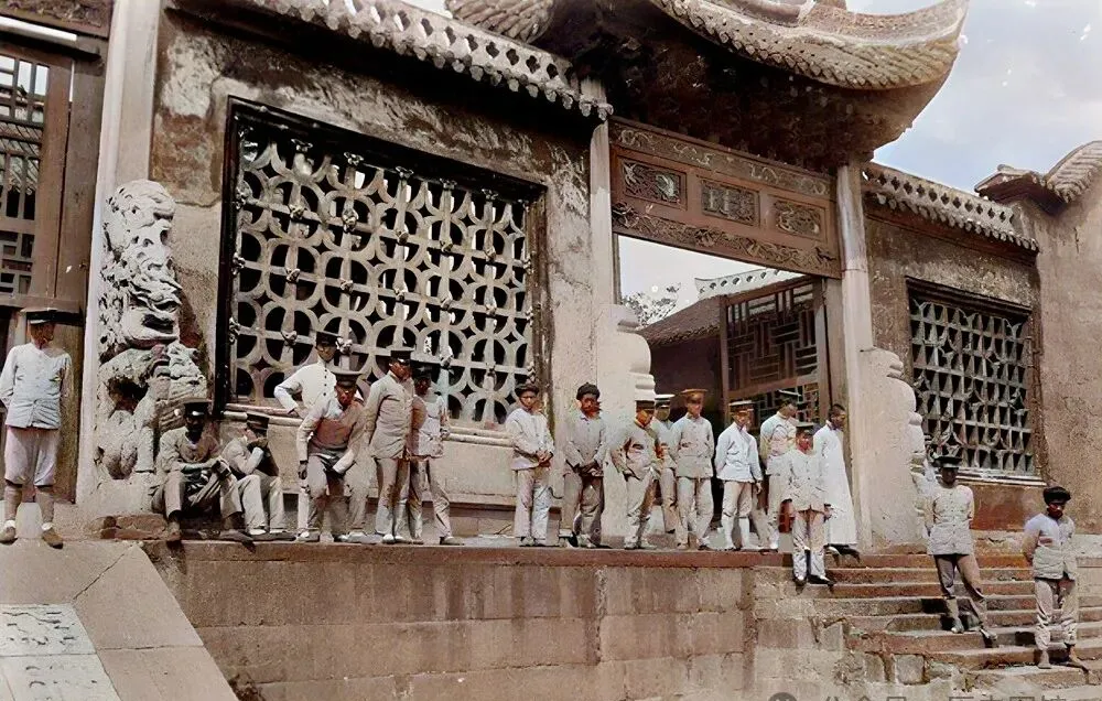 庙门口一排士兵站着,有的靠门,有的靠墙,那时候的热闹气氛跟现在不一样,大多是庙会或者祭祀,广场上人头攒动,泮池边上还有人在调解秩序,听说每年庙会都是最盛大的场面,现在想想,人挤人那阵闹哄哄的笑声,是谁的童年回忆。
