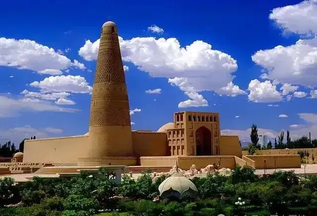 **图里这处黄土色的建筑叫苏公塔,**吐鲁番人常以它为傲,圆锥的塔身纹路复杂,密密斜纹一层接一层,搭在天底下特别扎眼儿,旁边的清真寺院墙绕一圈,夏天下午热气直往墙根儿钻,爸爸去过一次回来跟我说,进院子一股阴凉味扑脸,砖缝里抽着土气,那会儿进塔参观还得排队。