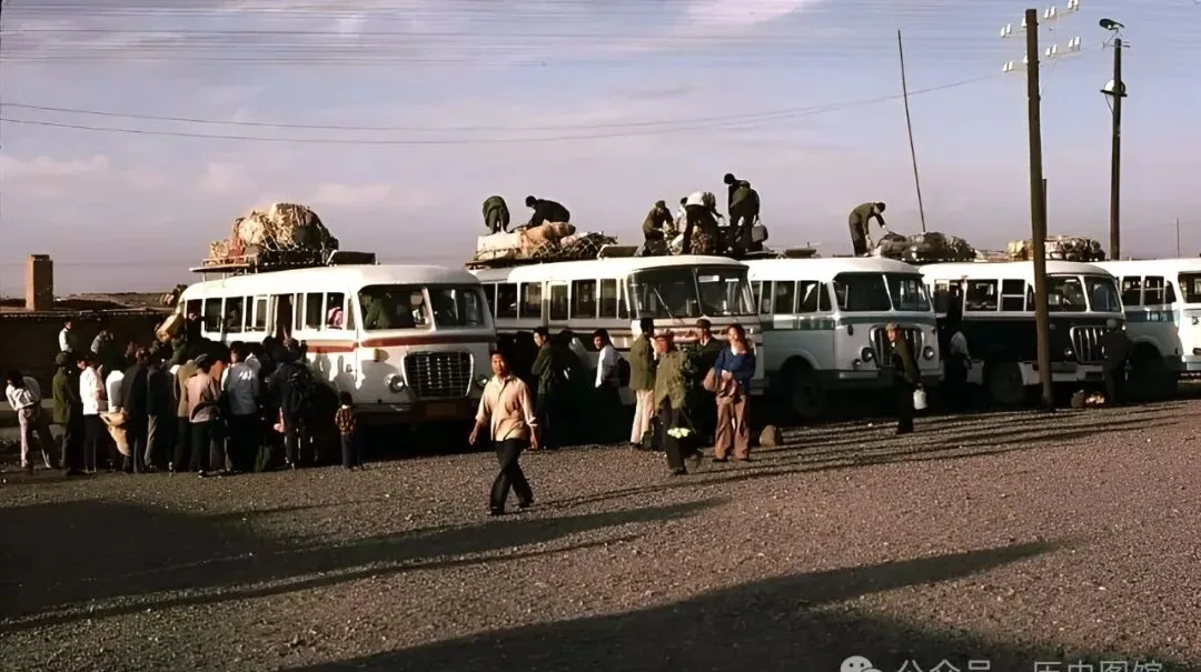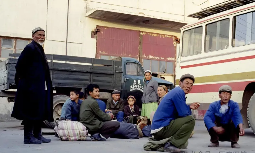 这是八十年代吐鲁番的一个汽车站,几辆老款客车排成行,人们挎包提袋,领着小孩走来走去,可都不慌不忙的劲儿,车顶上站着人装货,一袋袋东西扔上去摞着,司机会在旁边吆喝两声“快点快点马上开了”,那阵子出门坐车没现在舒坦,太阳底下一站能晒脱皮。