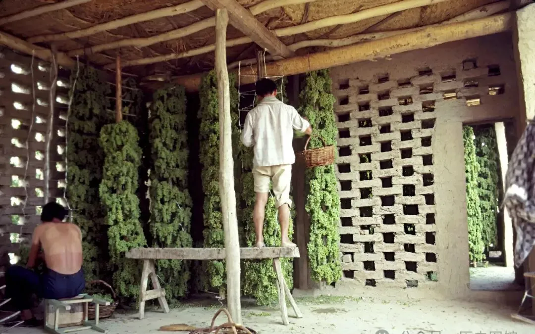 **葡萄干怎么晾出来的?**这张照片管见识了,泥墙里打着透气小孔,两个人站板凳上把一串串葡萄挂高高,夏天热风一吹,几个礼拜后,糖分全被太阳锁进去了,下边的男人席地而坐把落下的果捡起来,小时候常偷一串吃,没洗直接塞嘴,酸甜混着泥点儿。