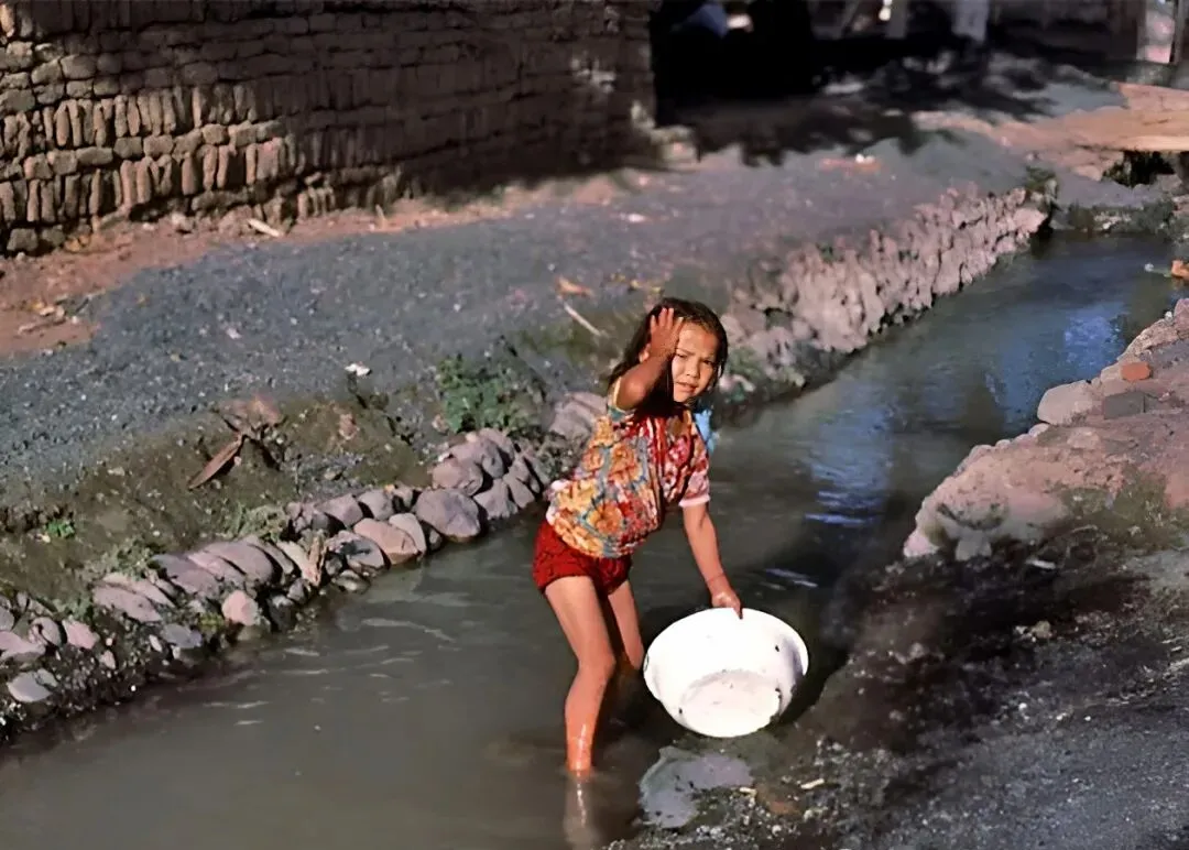 小溪边一个五六岁的小姑娘,手里端着脸盆,站在水里洗头,阳光下头发挂着水珠,那会儿家家靠灌渠流水,孩子就爱在沟边玩水,妈妈喊一嗓子才舍得回家,现在小区自来水一拧,夏天再没人光着脚下水沟淘气了。
