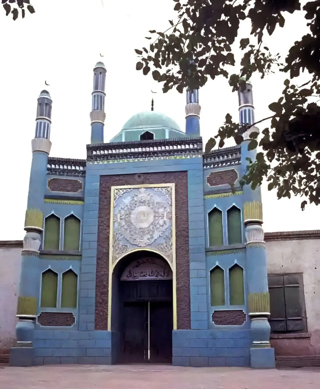 这一座蓝色清真寺造型别致,门口几级台阶往上,全身粉蓝和浅绿相间,穹顶金色半月,墙壁画着各种对称花纹,好几代人在这里过礼拜,祈福迎亲,一道大门关上都是自家平安。