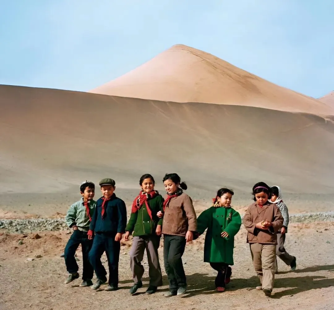 沙坡底下,几个小学生戴着红领巾,肩并肩走在黄沙上,背景几乎没有绿色,火焰山远远的看像一把火扯天而上,孩子们边走边闹,裤腿卷着沙,那个年代课间出门玩,回来一身尘土也没人嫌。