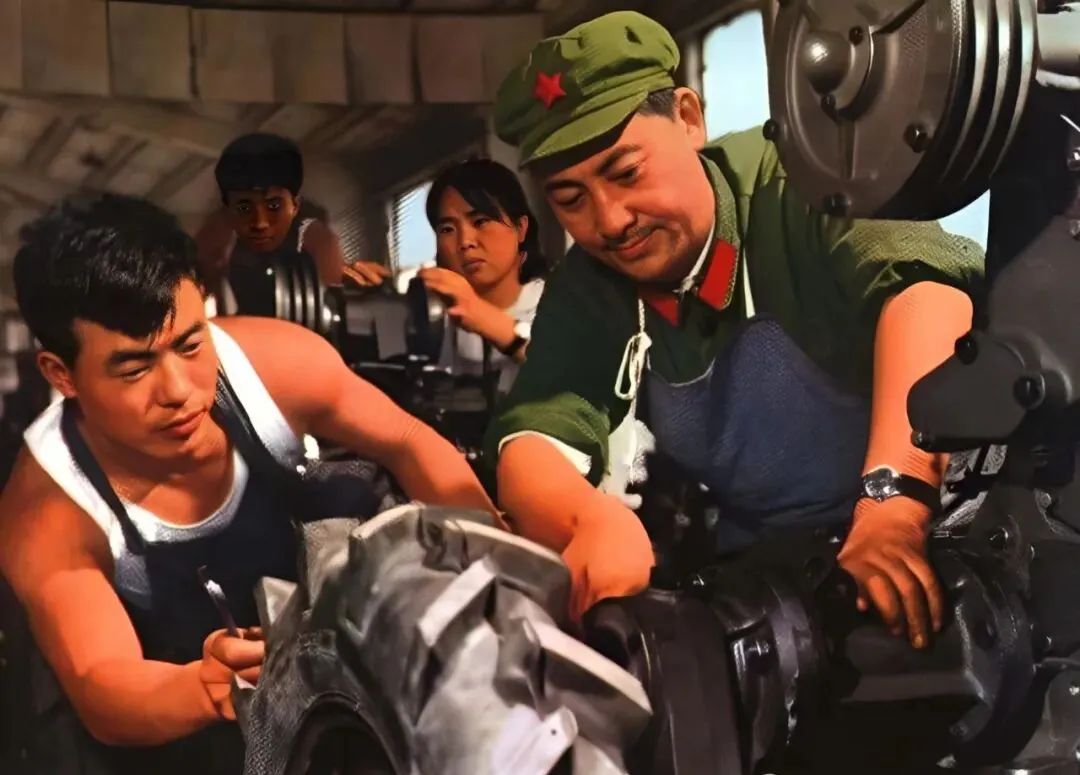 这张里头的工厂车间可真精神,老工人一身绿军装,肩膀宽厚,笑眯眯地里手,不用说就是带了多少年徒弟的老把式,徒弟们肩膀露在外头,筋肉鼓着劲,一看就知道是趁着年轻拼力量那种,车床边上铁屑亮晶晶地落,油污沾手大家全不嫌脏,屋里热得很,手一抹全是汗珠