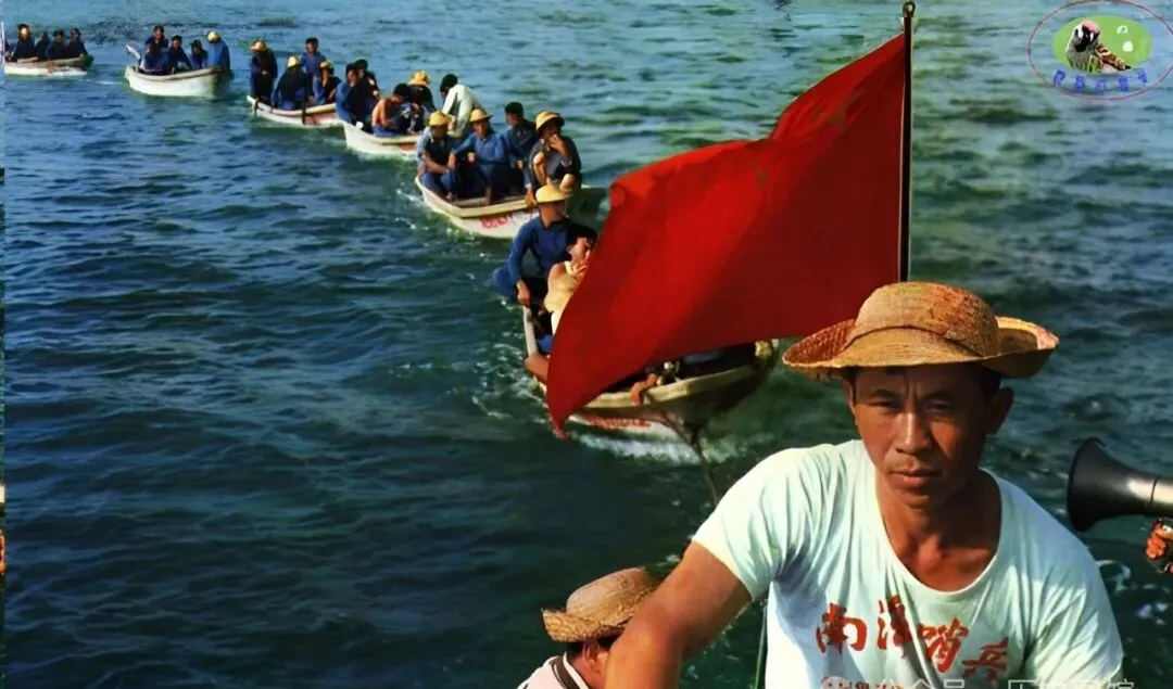 这水面铺开够蓝,前头船头飘着一面红旗,几个刚晒黑的民兵坐在头一只船上,身上的T恤印着大字“南海哨兵”,后头成串的小船拉开了队,水波荡着人影,每人肩膀晒得乌亮,手上紧紧握着桨,咬着牙,不论风浪多大也靠上去,至于守啥,他们都不多说,可你看他们盯着远方那劲头,就知道放心,全村人都指望着他们回家带鱼腥味。