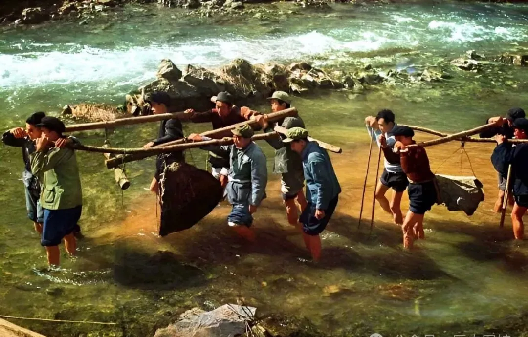 这张是典型的河道搬石头,一大帮人踩在河水中间,各自肩膀压着粗木扁担,两头吊着大石块,裤脚一卷就干起活来,有人光着腿有人穿着补丁裤,队伍里带头的是村里的干部,挑最重的干,嘴里常念叨着“谁怕水就别跟着进”,老一辈子那股子带头干的路子,镇上都知道。