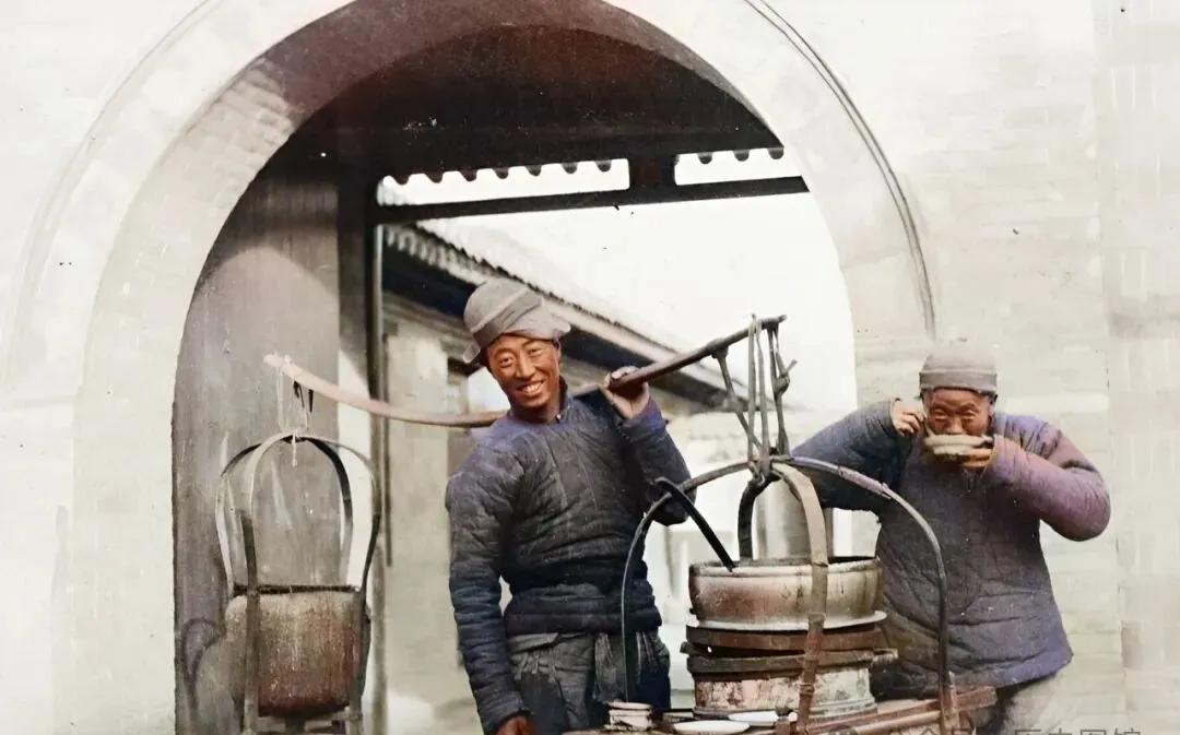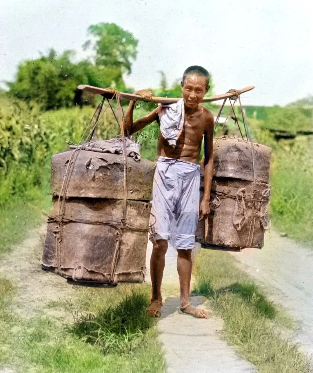 图中这个老伙计,扁担一上肩,衣服直接搭在肩头,后背晒得跟老树皮一个色,扁担的形状特别扎眼,一看两头翘得高高的,和北方用的平直扁担一点不一样,这样的挑法在成都郊外很常见,挑的货是两大只油篓,里面装满菜油,走在小路上,油篓和扁担随着步子一上一下地晃着,那股油香从田埂头就飘出来了。