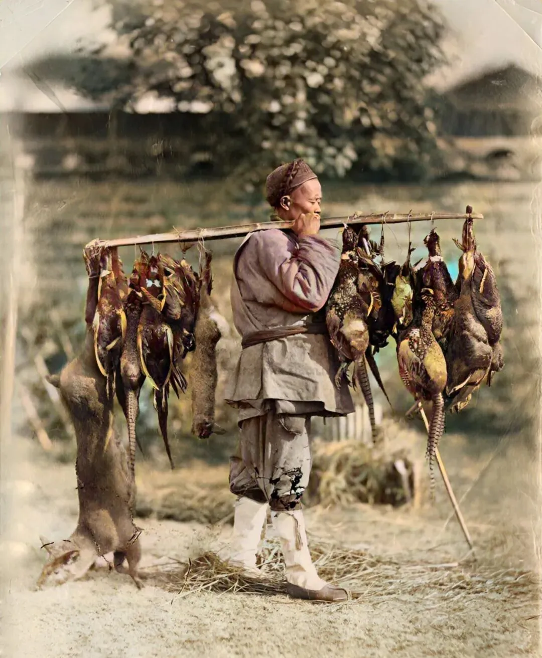 这个人肩上的不是寻常担子,整个扁担上挂满了野兔野鸡,扁担直直的,和四川山里挑货的翘头扁担又是两路子,在北方干活常常能见到这种直扁担,结实、稳当,掂在手里有点分量感,猎人一趟回来,全靠这根扁担把收获挑回来,一排排野味晾得整整齐齐。