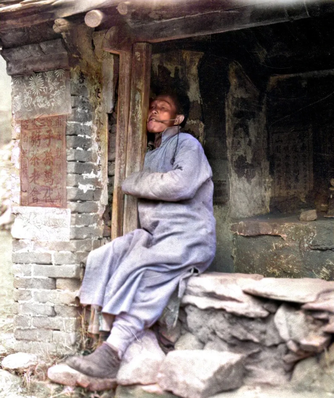 一眼瞧过去,照片上坐着个穿长衫的中年男人,人没进庙门,反而横在门槛上,两臂收紧抱着门框,瘦瘦的脸,细细的眼睛,动作别提有多奇怪了,最扎眼的还不是坐姿,而是他嘴里正死死咬着门框边的一根长铁钉,钢钉子一头粗着横着,另一头插在木头里,男人两颊凹陷,嘴角勒出沟,一根筋直蹦到太阳穴,旁人瞧着心发麻,偏偏他脸上没什么痛苦,反倒倦着一股子忍耐劲,表情让人琢磨不透。