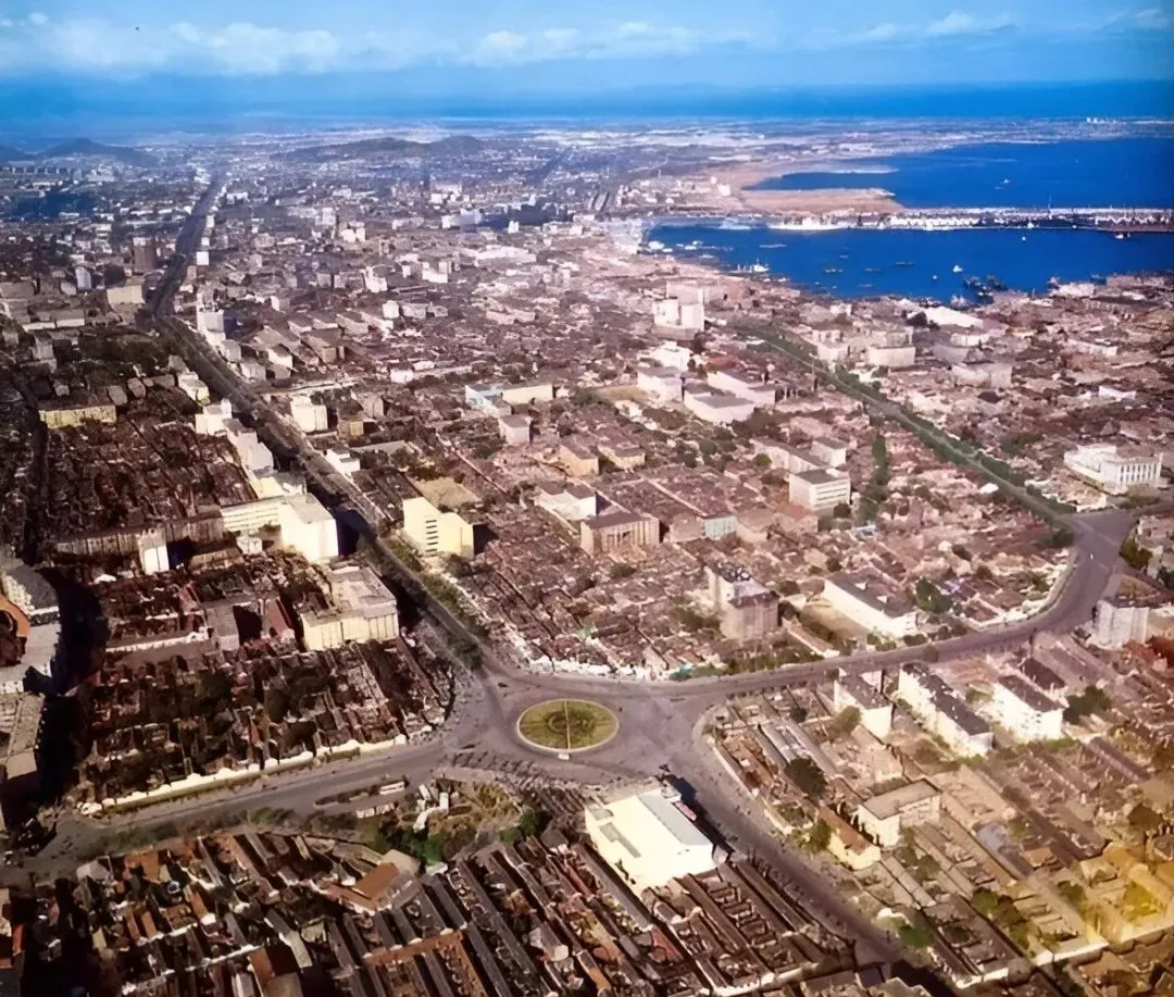 八十年代从天上看烟台市区,老照片把整个城市摊开了看,一排排方方正正的楼房,马路顺着笔来直去,远处大海蓝得扎眼,刚解放不久的样子,地上没什么高楼,全是灰顶房,不过人气不差,密密麻麻,天好阳光亮,烟台像一大张展开的旧画布,一笔一画都能看出岁月。