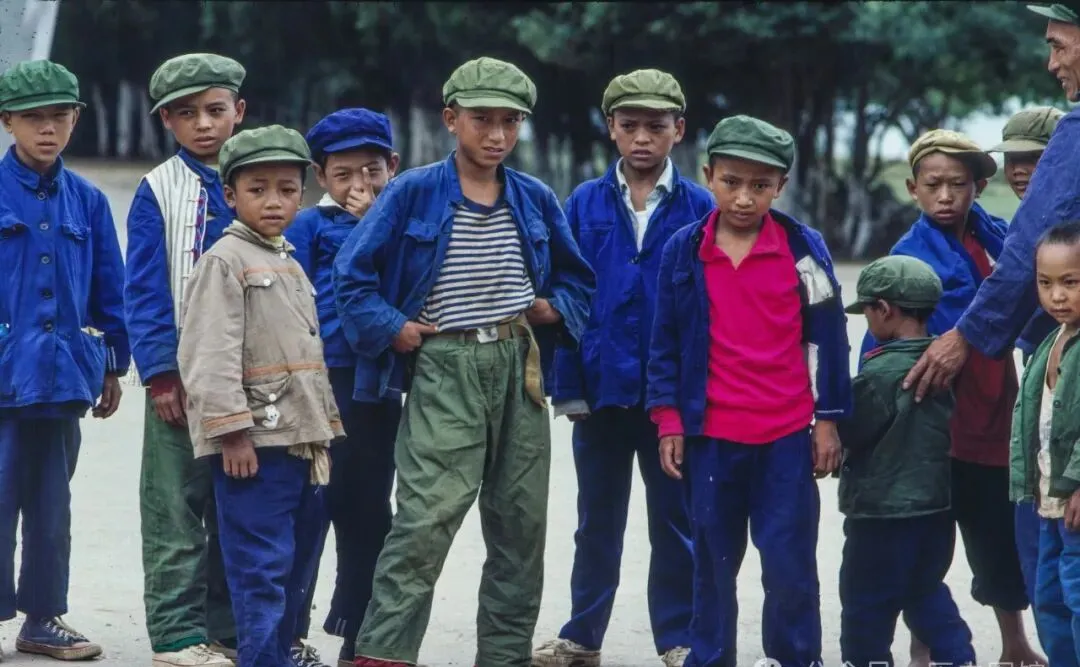 图里是桂林的孩子们,穿一身蓝布衣,脖子上敞着点口子,裤腰带勒得得劲,头上必备一顶军绿色帽子,谁家小子都不舍得弄丢,没破不算穿过。以前家里有点本事的,就给孩子添两件新中山装,不然都是哥哥穿大了轮给弟弟,乡下娃,一个个皮实又精着劲地站着。