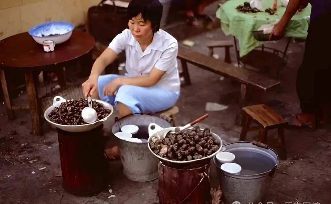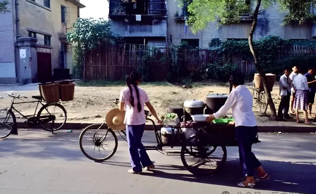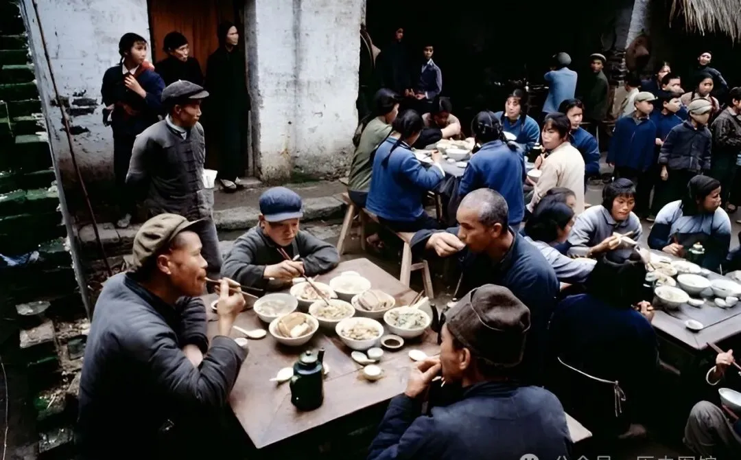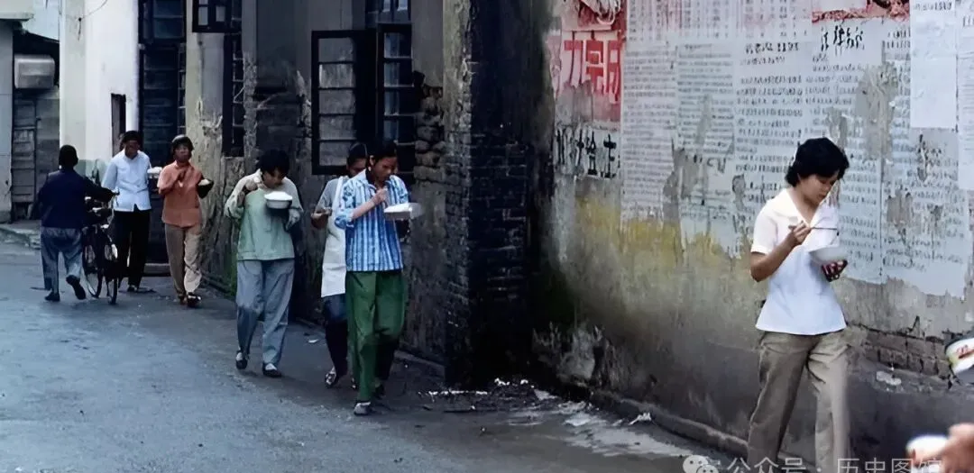 那会儿工厂下班、街口放学,饿急了不回家,端着大碗饭在巷子里边走边吃,墙上贴着红色的大字标语,饭里头全是大米、咸菜、青菜叶子,偶尔能捞着点猪油渣,吃一碗抹一把嘴继续干活。现在年轻人叫“走着吃”是潮流,那时候全城都这样。
