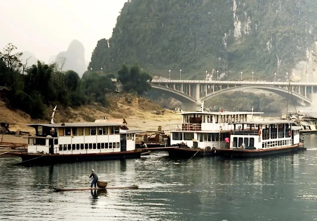 图里的这片风景,老一辈都叫漓江两岸,绿得叫人舍不得眨眼,水里头还带着点淡青色,岸边码头停着一排排大船小船,远处的山一个连着一个,比水墨画还有灵气。那时候人还没有去凿什么“打卡地”,就是坝下垂垂钓子,河边晾晾衣裳,烟火气和山水合着成一体。
