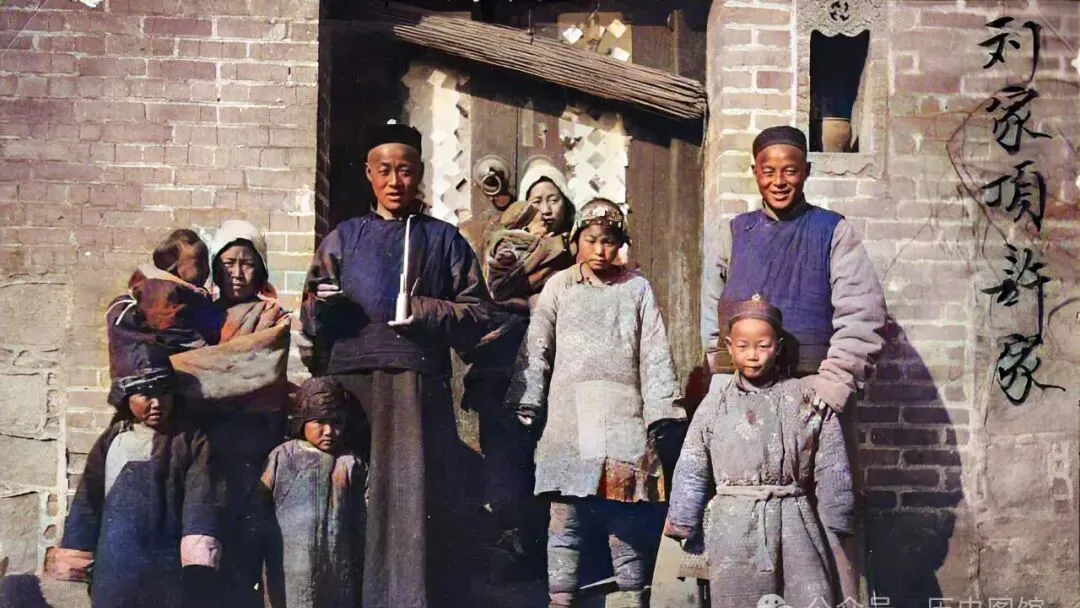 图中一大家子,站在门口,兄弟俩加上媳妇孩子,那股人丁兴旺劲隔着照片都能数出来,砖砌的房子,门楼上头还写着“利家顶许家”四个字,像是特意留给后辈看的,哥哥端着烟壶,弟弟手插兜,孩子们有的顶着大棉帽歪着脖子看人,女眷们也都站得板板正正。