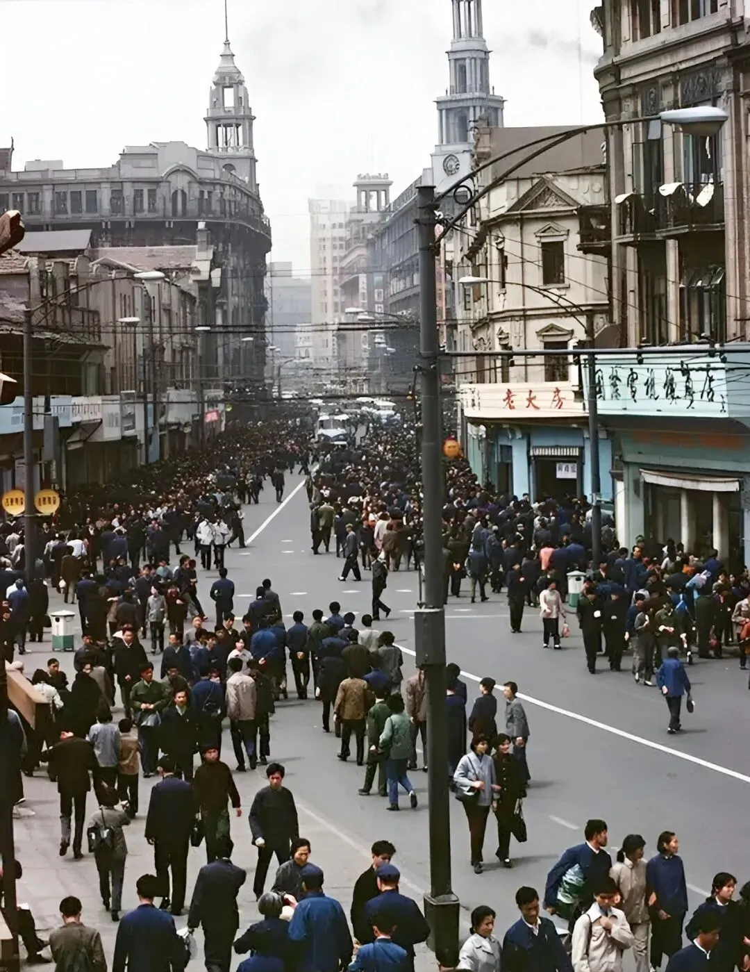图中这块地方,就是上海著名的南京东路,八十年代的南京路,人多到能看花眼,全黑蓝绿的衣服混成一片,路口两边“电视机商店”牌子还挂着,街上云集着商店,有时候逛一圈回家比当健身还累,那时候买东西讲究凭票,有时候队一排能等大半天。