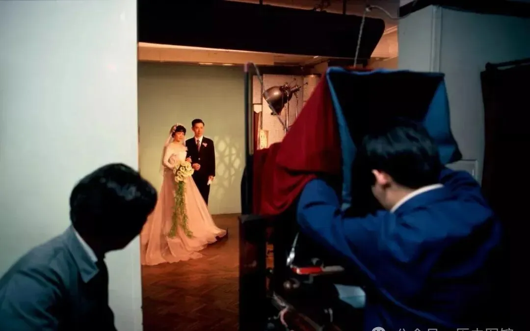 这个场景就是80年代照相馆里,新郎西装新娘白纱裙,老款相机底下埋着三脚架,还有红布罩,为了留下这张照片都得把最讲究的衣裳穿上,身边的人帮忙调灯光摆动作,“笑一个”还真不见得叫得出来,小时候家里有亲戚结婚请人帮拿花、递鞋,走一趟照相馆,感觉已经赶了回洋气。
