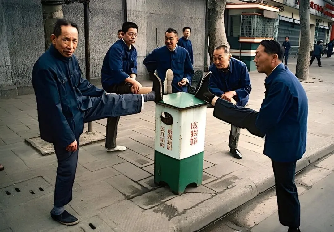 这个画面,怎么说呢,果皮箱都能当健身器,路边五位大叔,衣裳整整齐齐,各抬一只脚踩着,压腿聊天两不误,没啥锻炼场所,废物利用的主意各有各招,逗留的都是老邻居,没准还能边拉拉家常,说着说着就活动起来了。