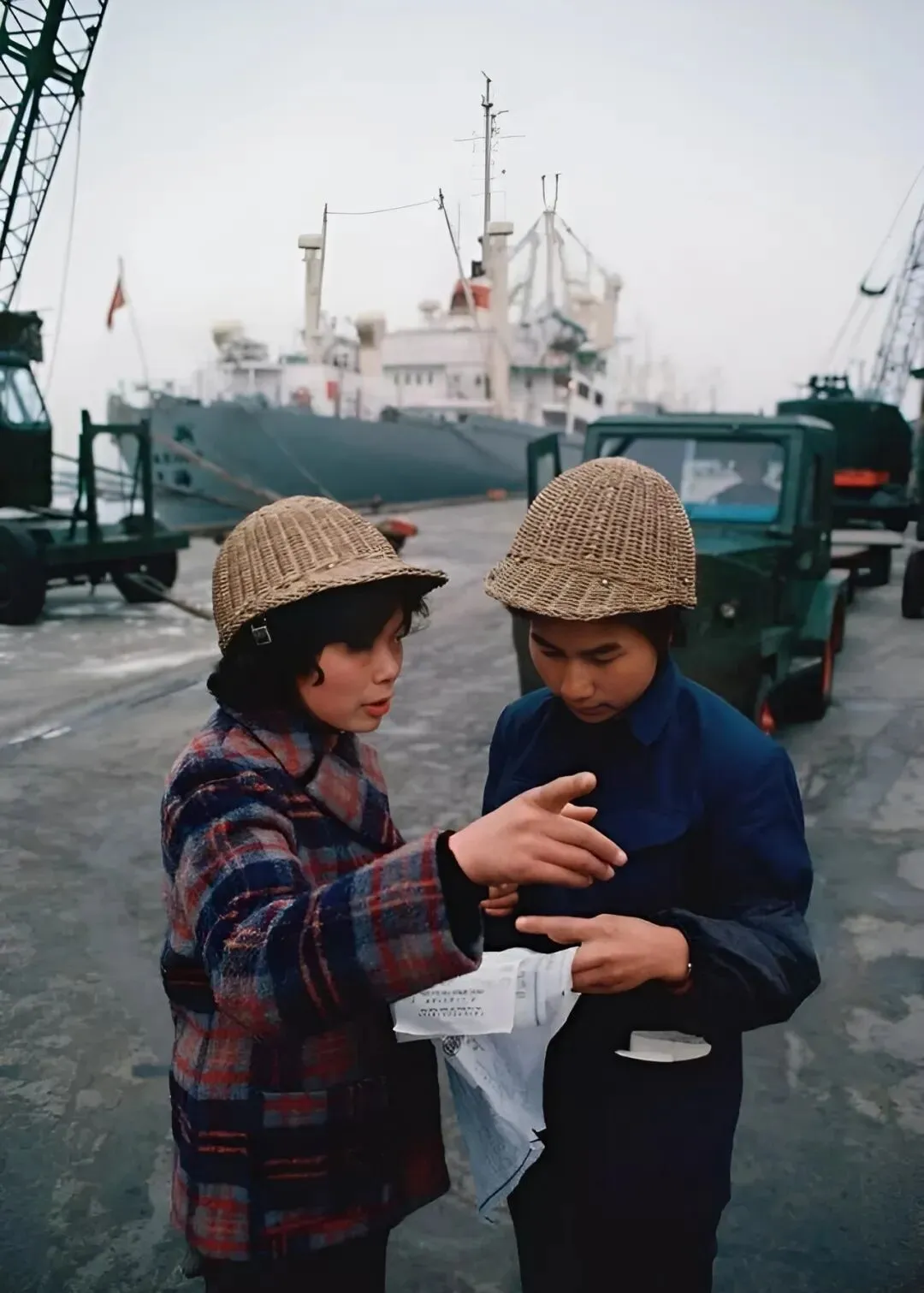 这里有俩女工头戴藤条安全帽,80年代码头上一景,任务一交接,动作麻利,说话的手势利索,背后是白色大轮船,港口上还飘着腥咸味,藤帽戴着透气,那会儿干活不分男女,谁都得上手,家里人常说,女工顶半边天不是喊喊口号。