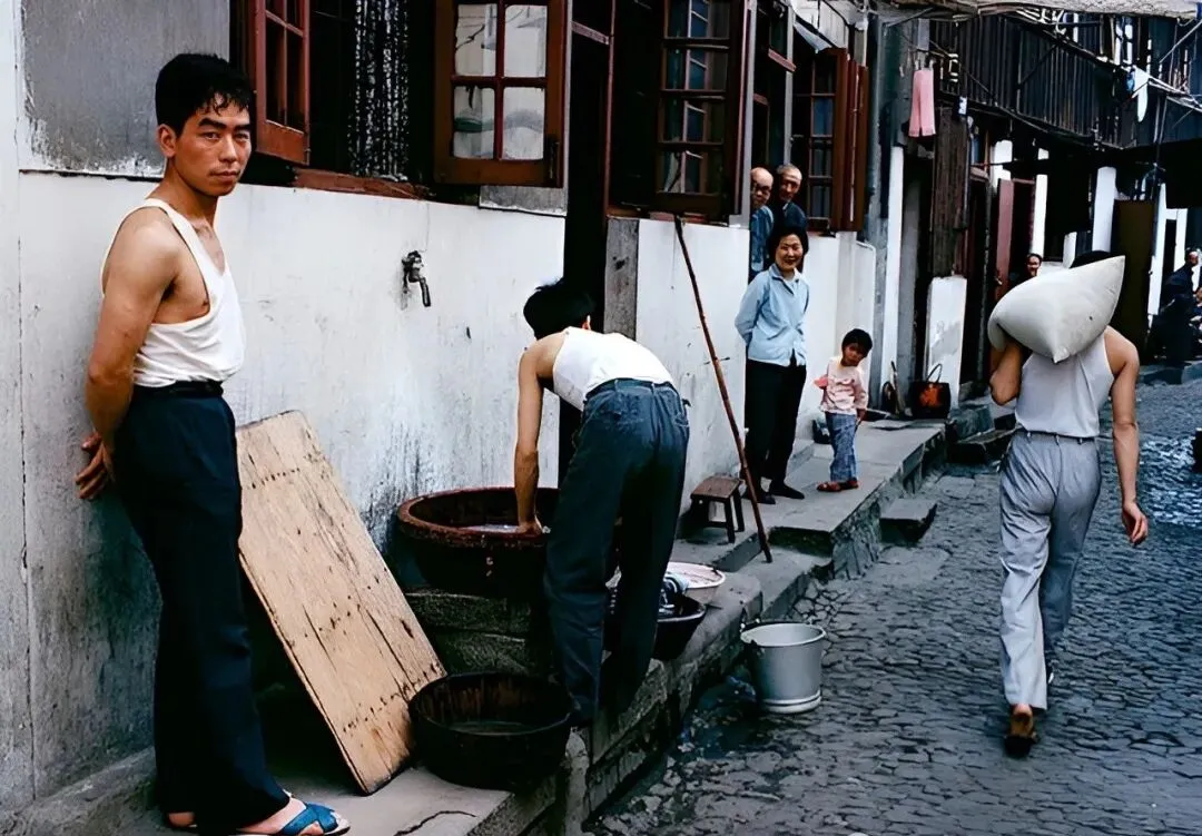图中是上海的老弄堂,男人赤膊站着一盆水,另一位直接弯腰洗衣服,后头围观的叔婶和小孩都把头探出来,有的靠在门边,笑眯眯地看热闹,边上湿漉漉的石板地,屋檐下挂点衣服,日子过得不慌不忙,本来都是自己人,生活就在巷弄里摊开来。