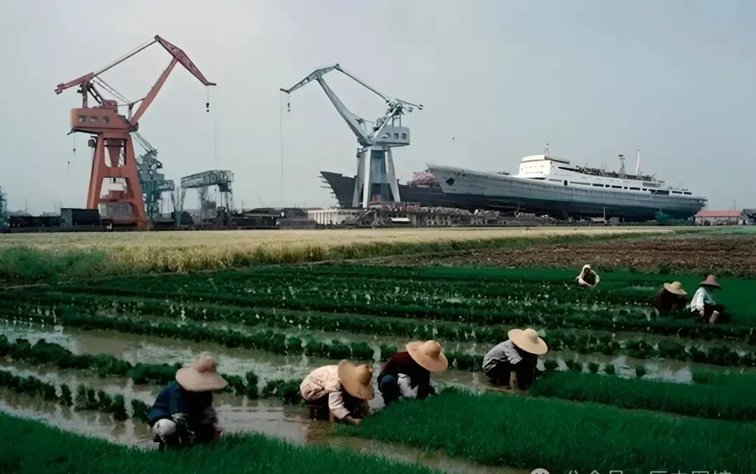 一张照片里,前头是农民插秧,后头起吊机吊着刚造的轮船,田间人弯着腰,田泥粘着裤脚,背后却是钢铁大怪兽,这种场面现在真是见不着了,那会儿造船厂边上就是农田,工农离得近,刚建好的800吨轮船一浮水,乡下的娃儿都要看一眼才算过瘾。