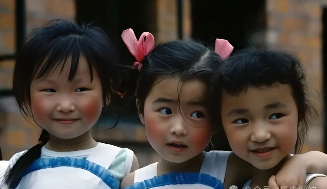 三个小姑娘脸上扑着粉红的腮红,当时文艺汇演、学校表演常有的事儿,头绳扎得高高,小眼神左右瞟着,舞台还没上,心可跳得快,那个年代的孩子,圆脸上一层腮红出镜率暴高,说不定有谁小时候就有过类似的打扮,只是旧照片没留住。