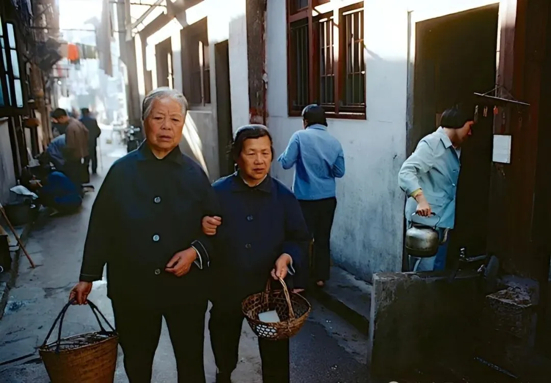 弄堂口,两位老太太挽着手臂,手里提着竹篮子,脸上没什么表情,买菜这种事一天不落,家家户户后备菜是在菜场不是冰箱,篮底下装的是青菜豆腐瓶子酱油,“超市”都还没影,谁手快谁先选,路上碰见熟人打招呼问声“买啦”,家常气一点没断过。