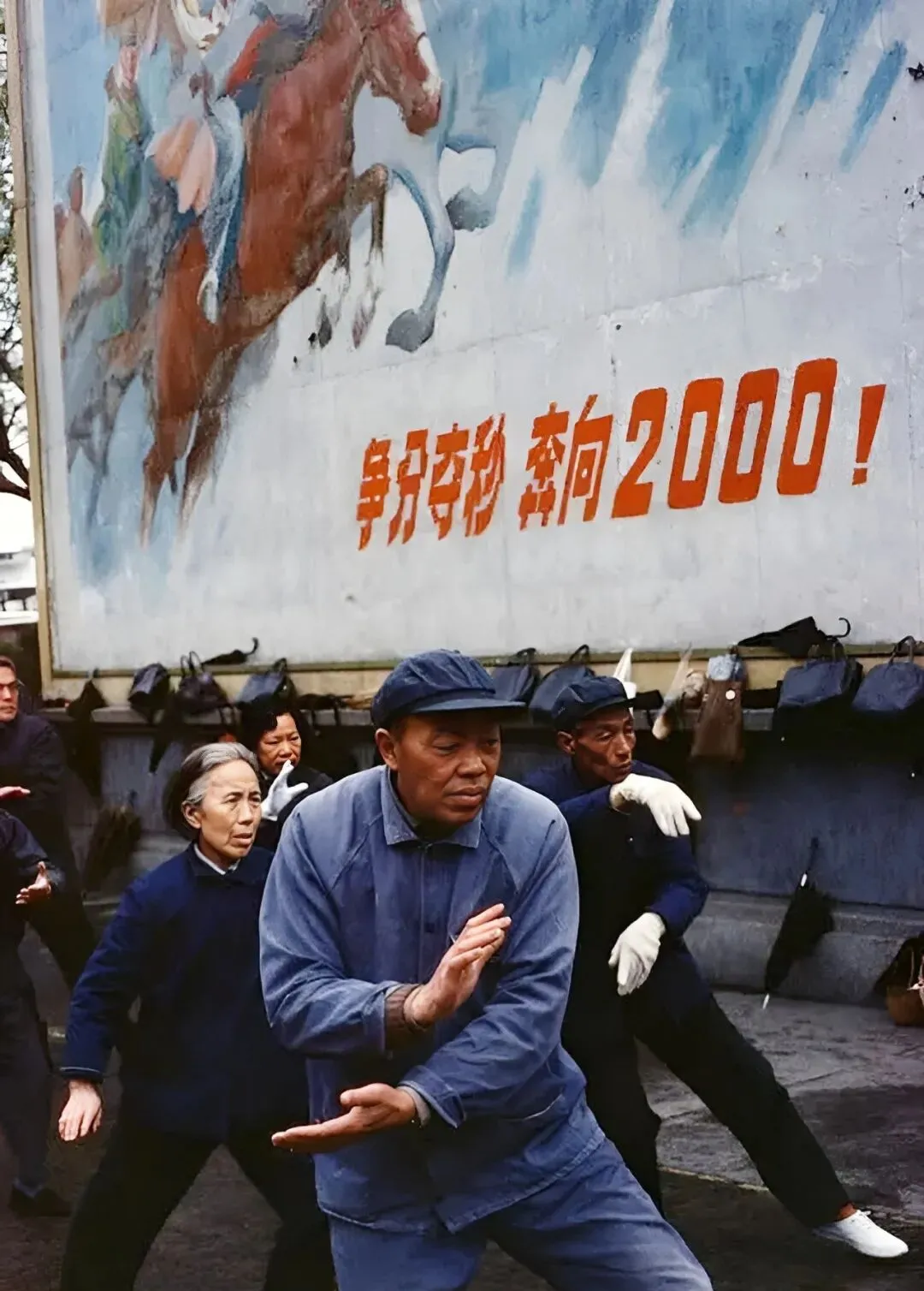 画面里,一群叔婶跟着宣传画下练太极,墙上那条“争分夺秒,奔向2000”,站得笔直,动作慢慢悠悠,但气势一点不虚,老一辈人健身要啥健身房,空地一块,队形一摆,自己找乐,偶尔聊到说现在公园里健身器材多了,动作却还是喜欢照以前的来。