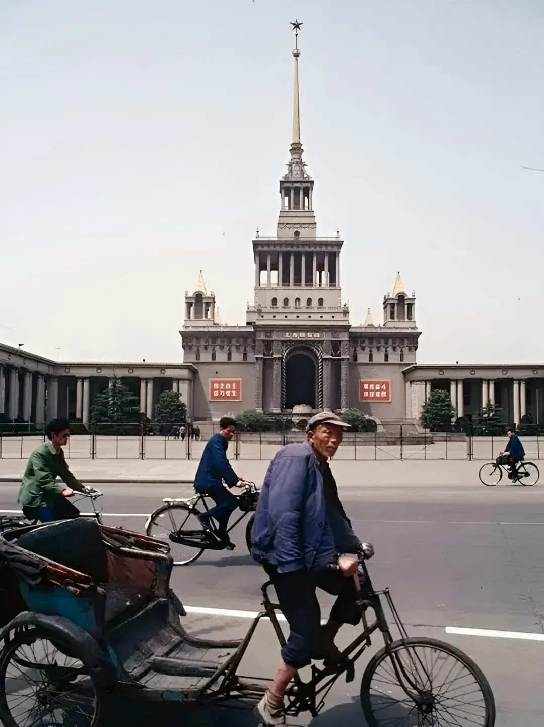 老照片里穿蓝夹克的男人,骑着三轮车路过上海展览中心,后面高高的尖塔特别显眼,马路宽阔,却没什么汽车,都是骑车的,一排排扫过去静悄悄,连灰尘都少,搬家拉货都靠三轮车,要说起那时候谁家搞运输,这玩意绝对能折腾出一身汗。