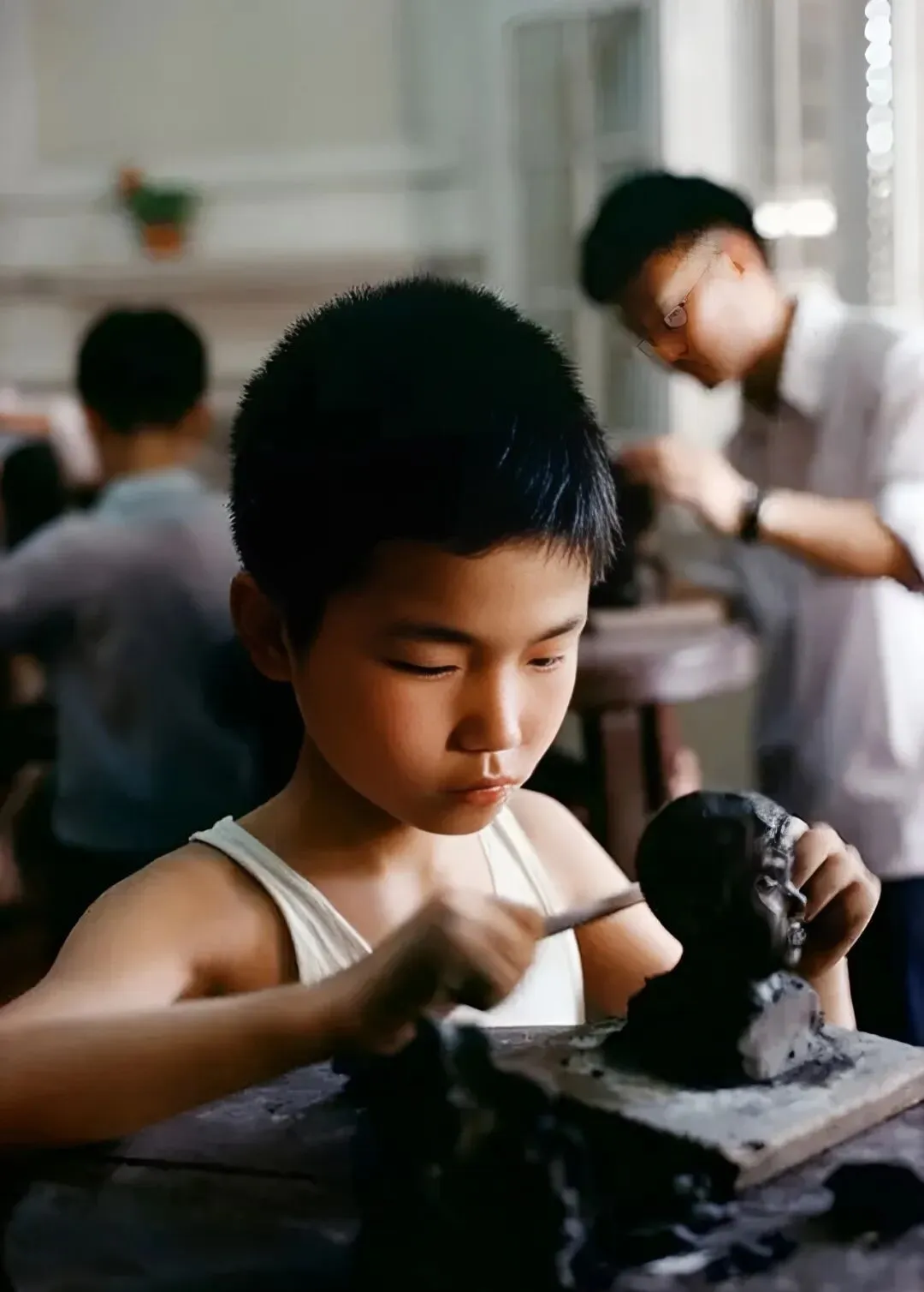 盯着照片看半天,少年宫里小男孩在专心搓泥巴,脸一板,手法还真有点讲究,泥块在小手里变成眉眼鼻子的模样,旁边老师带着点骄傲盯着学生,桌子上沾着一排排黑印,干完活大家拍拍手,笑着跑出去玩,泥巴还得晾干,第二天去学校接着上色。