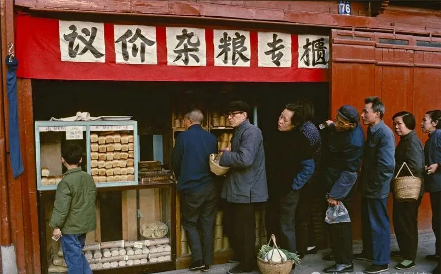 这个画面,在上海八十年代实在常见,牌子上写着“议价粮专柜”,队伍拐来拐去,篮子拎在手里,队中的人大多抬头盯着柜台,有的干脆一屁股坐地上,在那年月谁家都要票据,白面头、馒头什么都是按限量买,家里要是谁拿回来点面包,都能当件喜事聊半天。