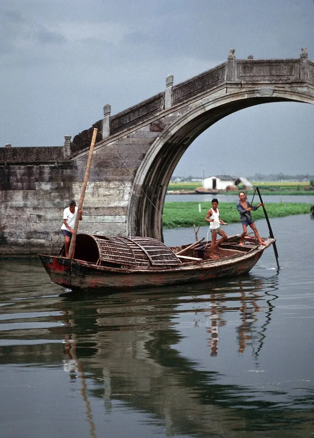 这里头拱桥下正划过一只大船,篷子还没全合上,人在船头撑篙,一副轻松闲适的样子,小时候跟着父亲去打鱼,桥下对着篷船喊几句,声音来回荡,水面起了风,晃得一船人脸都笑开了,家人说,这水路走惯了,一根竹篙下去,力道和方向都得靠经验。