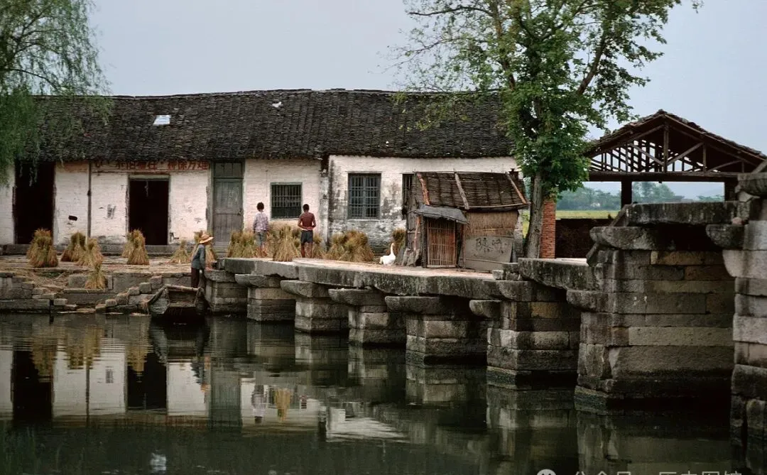 这边石头梁桥横在村口,老房子院外码着稻草,有的人弓着腰在拾稻穗,有的人扛着锄头站着歇气,桥墩上青石已经磨出槽,小时候跑过去摸一把,也学着坐在桥台上晃脚,天热水面上反光晃得慌,秋天桥头多晒谷子,村里哪家有喜事,就是从这桥上吹锣打鼓迎回去的。