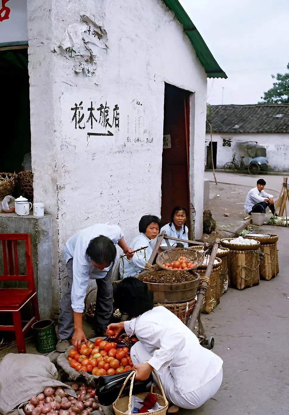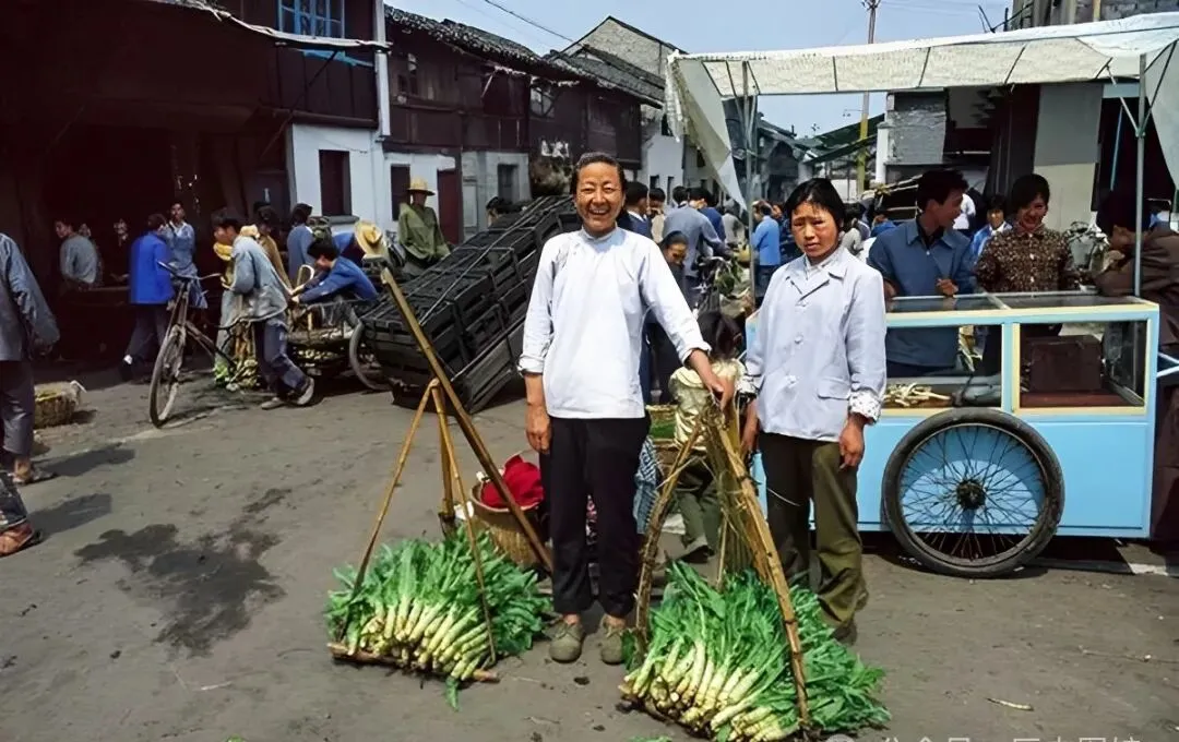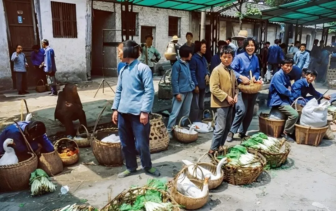菜市场照片最热闹,竹筐码地上,青菜、鸭、鹅一摞摞,卖菜的、买菜的、过路的,招呼声笑声全混一块,很多人穿着蓝褂子,女人胳膊上拎着篮子绕着摊头转,一只鸭子老老实实蹲在篮里,男人木屐踩地嚓啦嚓啦,挑菜砍价都是那时独有的烟火气,没了现在商超那股冷清。