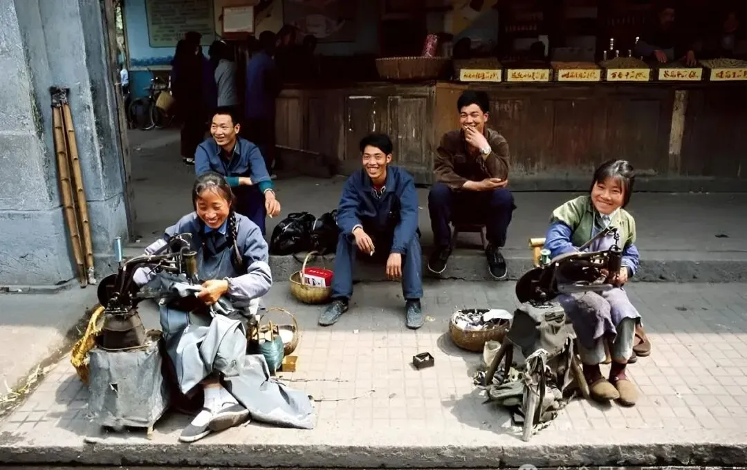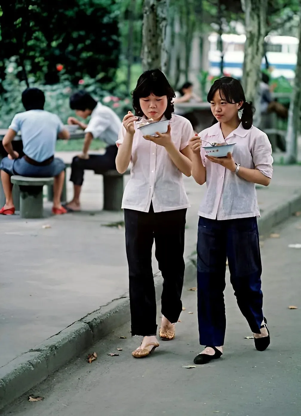 姑娘们低头捧着搪瓷碗走在街头,碗里热气腾腾,穿着黑色布鞋,撑着腰在巷口边吃边聊,这年头谁还端着碗走出家门,那个时候街头巷尾“边走边吃”多见,天气热饭滑凉,冷了再抬头,家门口的梧桐树已经飘了半地叶。