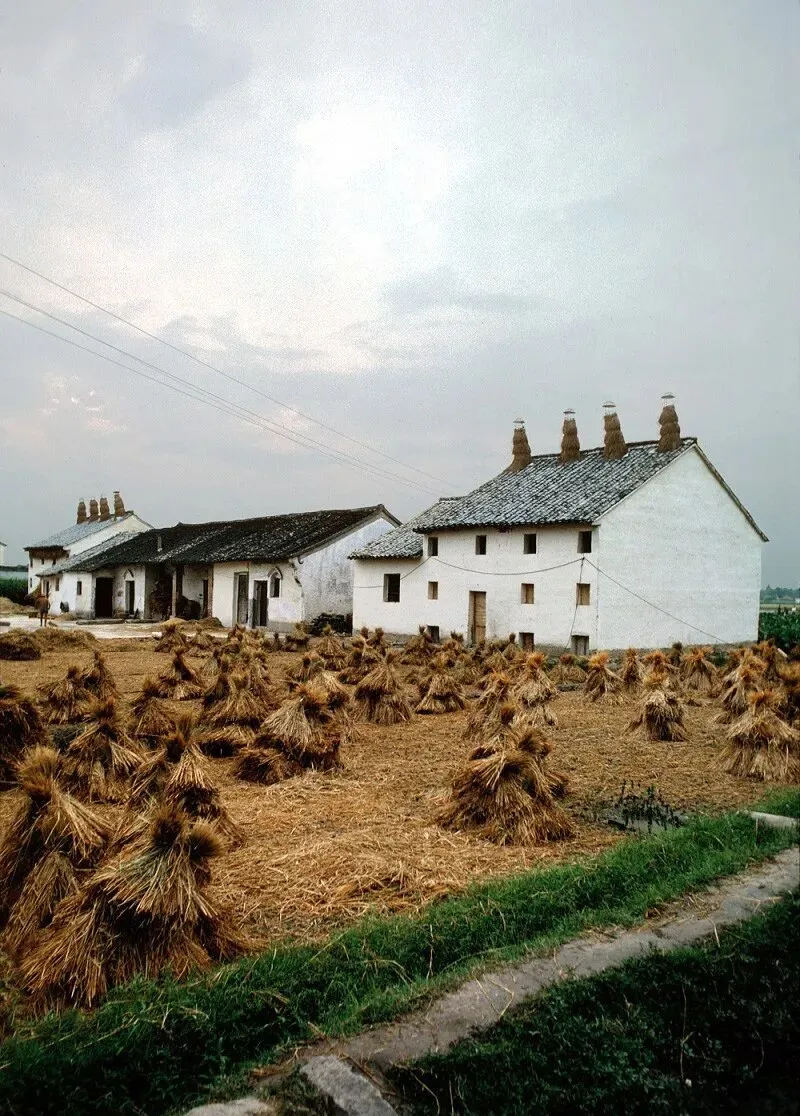 烟囱屋跟田野挨得更近,一户人家就是一口烟囱,门前的孩子站着等爹娘回家,白墙黑瓦头顶几根烟囱像把手插腰一样骄傲,院门前有收割过的稻把,老屋新事一样不少。