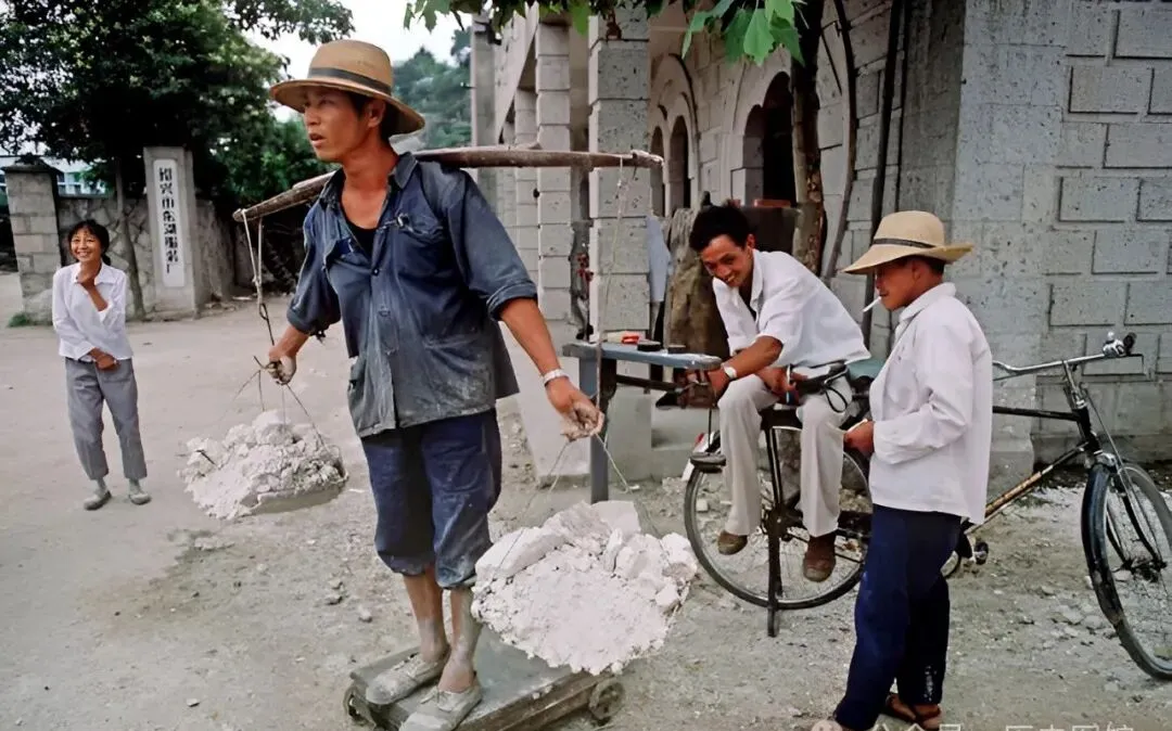门口工人挑着筐子称石灰,汗水湿透了衣襟,旁边男人蹲着负责登记录数,天热汗流到脚板上,脚下的土也都是石灰粉,家里有石灰工的,总能从村口远远认出自家人来。