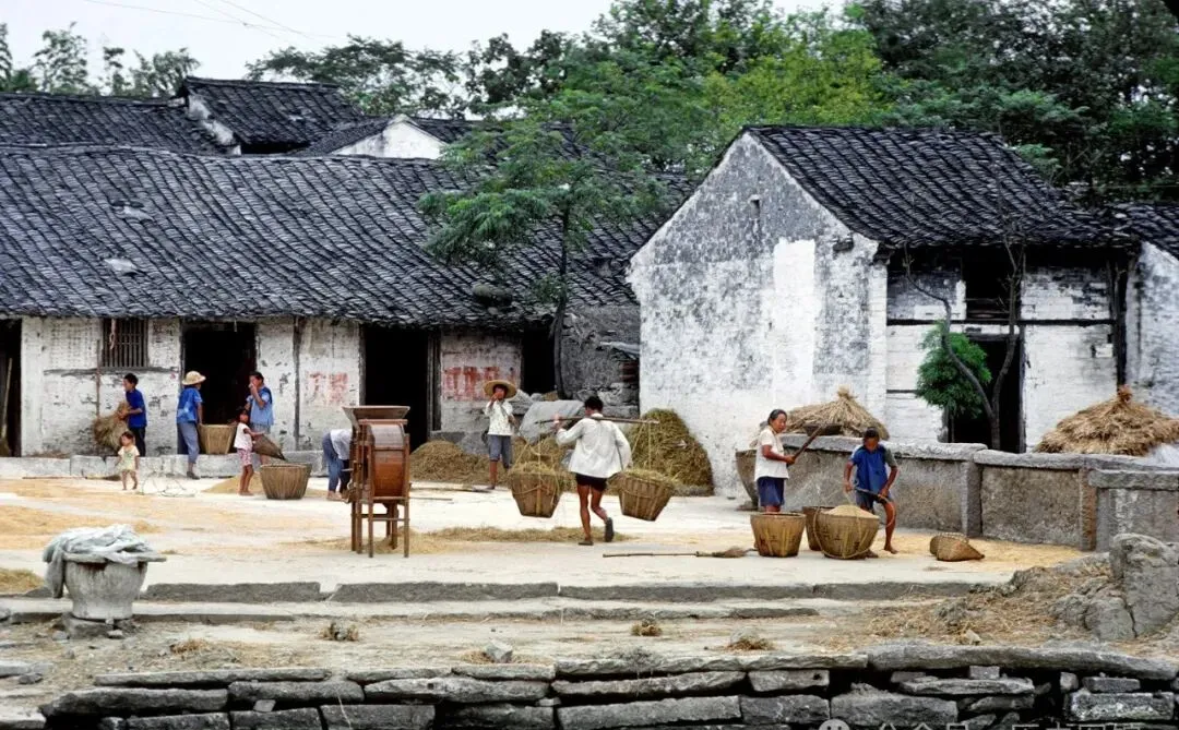 农家在院子里忙碾谷,风鼓机支正中,男人女人各自分工,箩筐一口气倒下去,粉尘弥漫半个晒场,孩子们爱趁机在稻草堆里钻猫,晒谷晒麦时候,邻里都出来帮把手,分工明白,画面里都是日常的忙活劲。