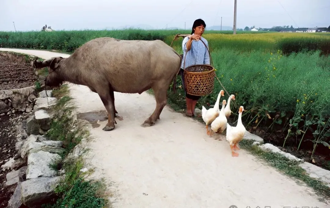 女人手里挑着竹篮,赶鸭子回家的路上带着一头大水牛,这种画面小时候天天见,油菜花刚开下雨地软,一双草鞋踩得泥鳅都钻,水牛往前一站就挡住半条路,女人随口嘱咐“慢点儿别摔了”,一尾小白鹅追着队伍走得飞快。