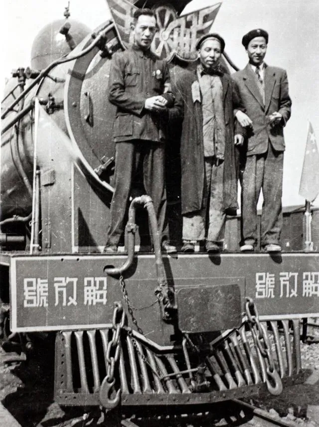 图中这个黑黢黢的大铁疙瘩叫“解放号”,头顶红色的翅膀标志,一溜大链子挂在车头,三个不同打扮的人站在最前边,身上的衣服,一身咖色中山装,一身旧灰长衫,还有一位西装加贝雷帽,颜色和身份都摆在那里,看着就有点历史碰头的意味。