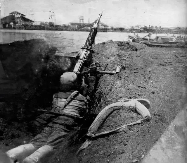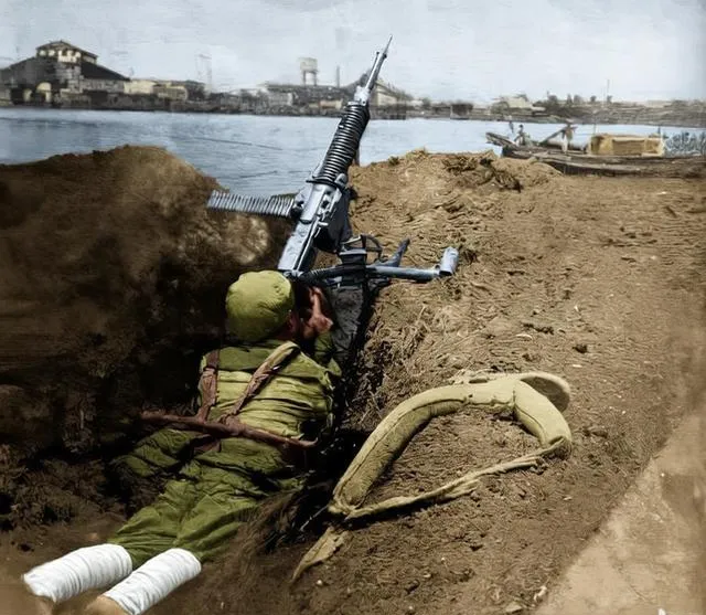 一身绿色军装的战士卧在泥里,手里架着机枪,镜头拉到远处是条大河,岸上树影稀疏,肩上绑着绷带还能看到泥巴粘住战服,边上扔着干瘪的救生圈,气氛绷得紧紧的。