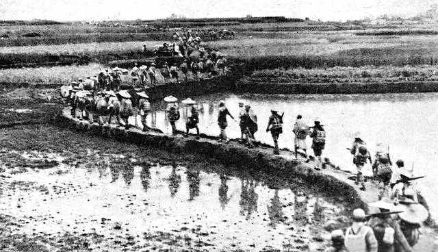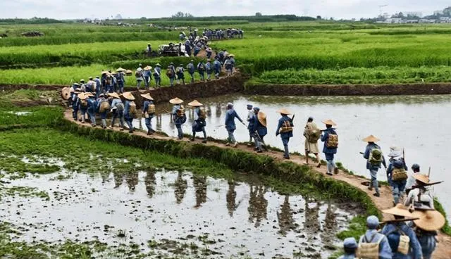 这趟能看到穿着蓝衣绿衣的,斗笠压得低低的,背麻袋挎水壶,在田埂上一窝蜂往前冲,两边水田一望无际,有人踩滑了赶紧扶一把,不叫打乱队形,下雨天雨伞撑着也不敢落下,累到鞋都被水泡松了还得继续赶路。
