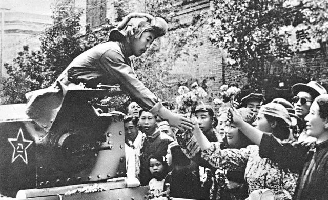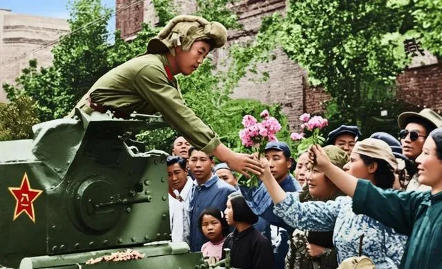 这个场景可热闹,坦克前面坐着解放军战士,下面一溜站满了伸手的人,大伙争着递花,姑娘绾着头巾,流行的花布衫,男的穿着夹克或大褂,表情比天晴都敞亮,人人都想往前凑一凑。
