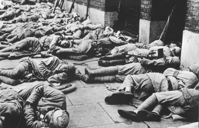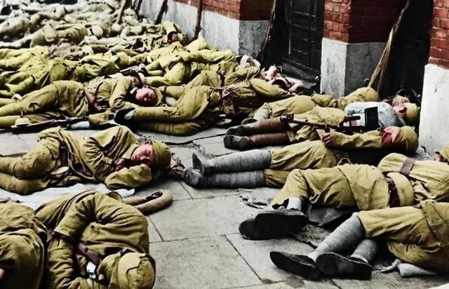 南京路的水泥地,一地黄衣战士横七竖八睡得死,身侧搁着枪,袜口还绷得紧,有个人手枕脑袋,旁边人抱着背包,一直没换下来的装备就这样当棉被用,有点冷也只能蜷着。