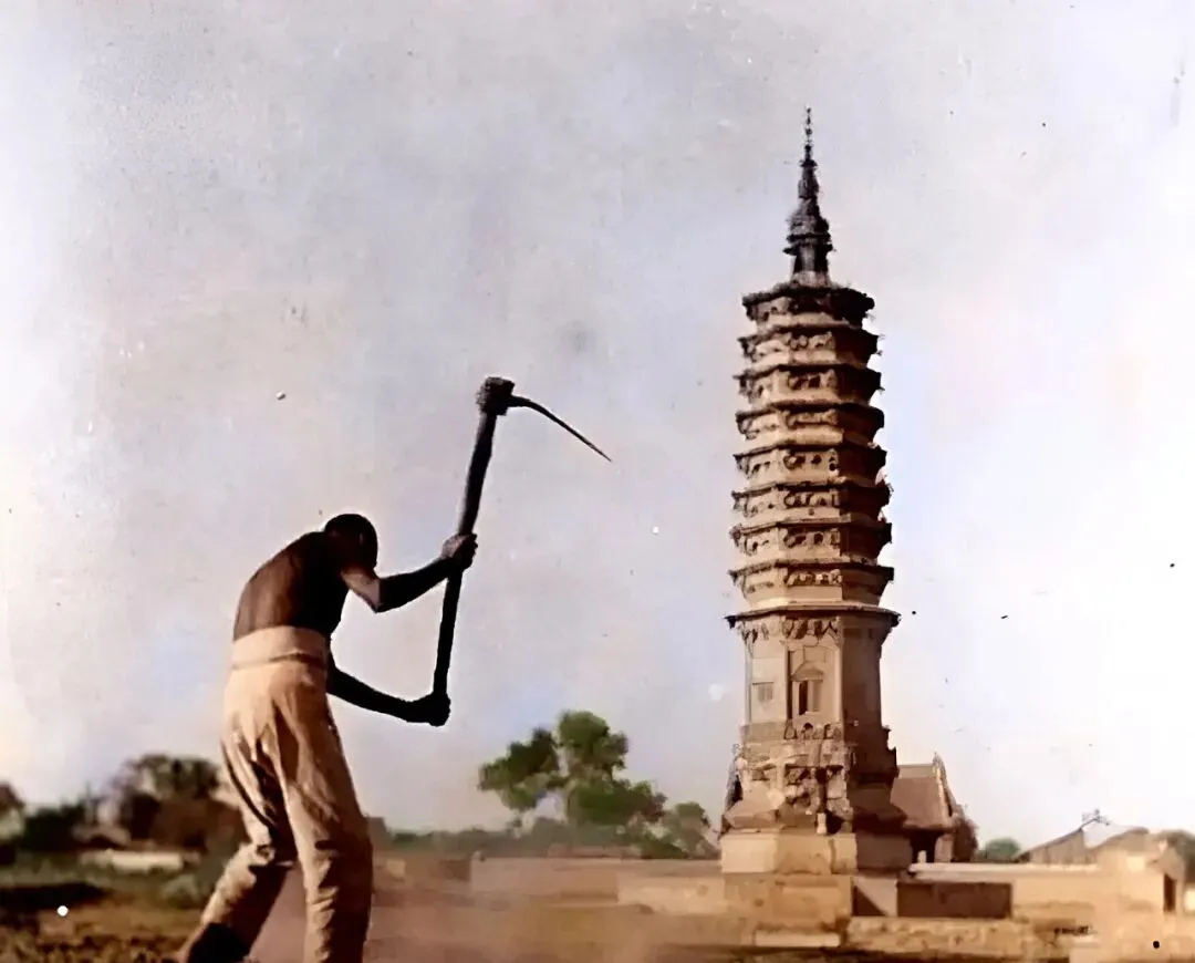 说是正定多古塔,乡下人脚下的土可一点不轻闲,图中这位打着赤膊挥着大锄头,后面站着就是那座九层澄灵塔,大砖结构,顶上塔刹高高翘着,有时候人和景凑在一起看着更实,就好像塔是镇着一方土地的,农人种地一头汗,塔却千年没挪窝。
