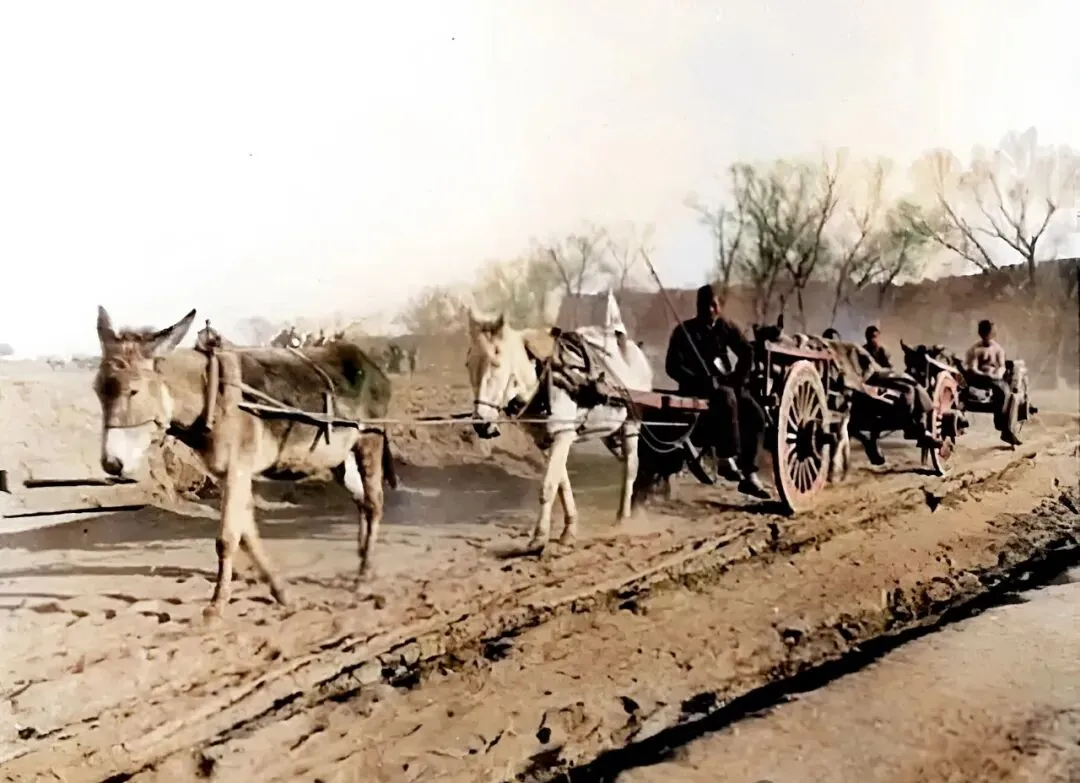 这条是进城的老土道,车轮印打得深,两边灰尘腾腾的,几辆驴车排成队拉货赶路,春秋天的早市,头车上的人带着麻布大褂,谁手头没点要搬的东西,坐驴车颠颠颠晃着,慢是慢,可也踏实。